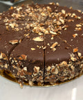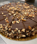 The cake is finished with a smooth chocolate glaze and a generous crown of golden roasted almonds, creating the signature "Croccante" (crunch) that gives this traditional dessert its name. A rich, nutty, and authentically Italian experience.