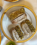 Almond paste (sugar, apricot kernels, water, dried EGG whites, glucose-fructose syrup, preservative: potassium sorbate), almond flour (ALMONDS), pistachio flour (PISTACHIOS), golden syrup, icing sugar, egg whites (EGGS), pistachio nibs (PISTACHIOS), Belnap Neutral Fruitgel (water, sugar, pectin, citric acid, potassium sorbate).